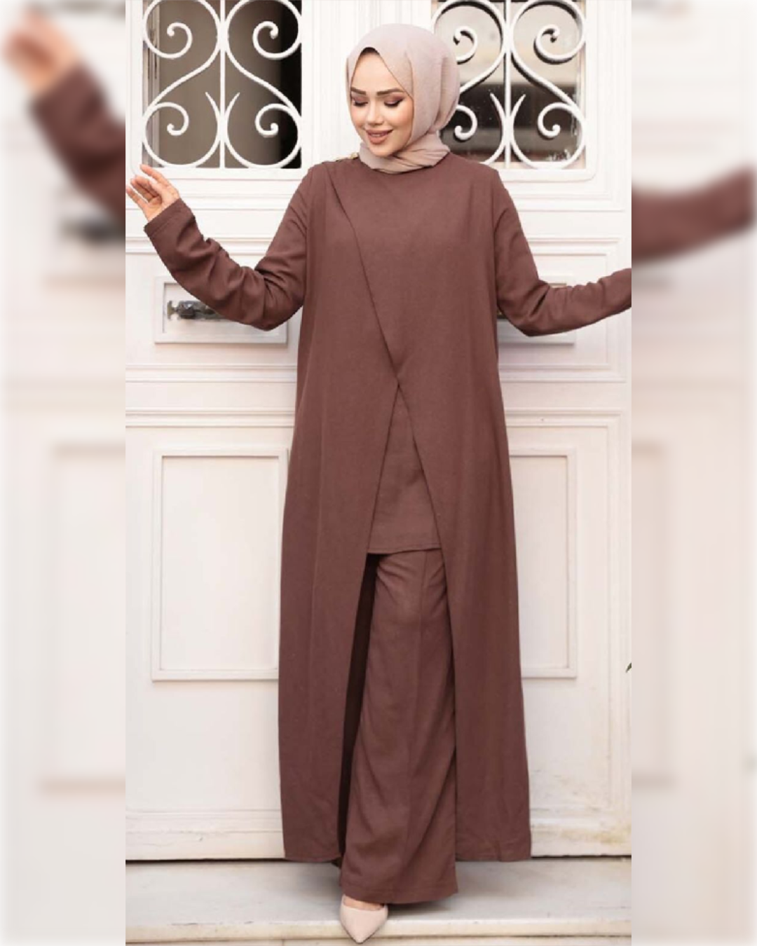 Elevate your modest wardrobe with this three-piece coordinated set featuring a long, open-front overlay, wide-leg trousers, and a matching top. Designed in a rich mocha brown tone, this ensemble offers both elegance and comfort. The minimalist cut with a flowy drape gives it a chic, modern look, while the soft, breathable fabric ensures ease of movement throughout the day.