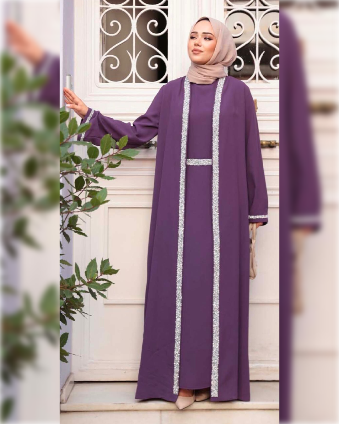 Elegant Purple Abaya with Silver Embellished Trim عباءة جورجيت كلاسيكية أنيقة باللون البنفسجي الجميل
