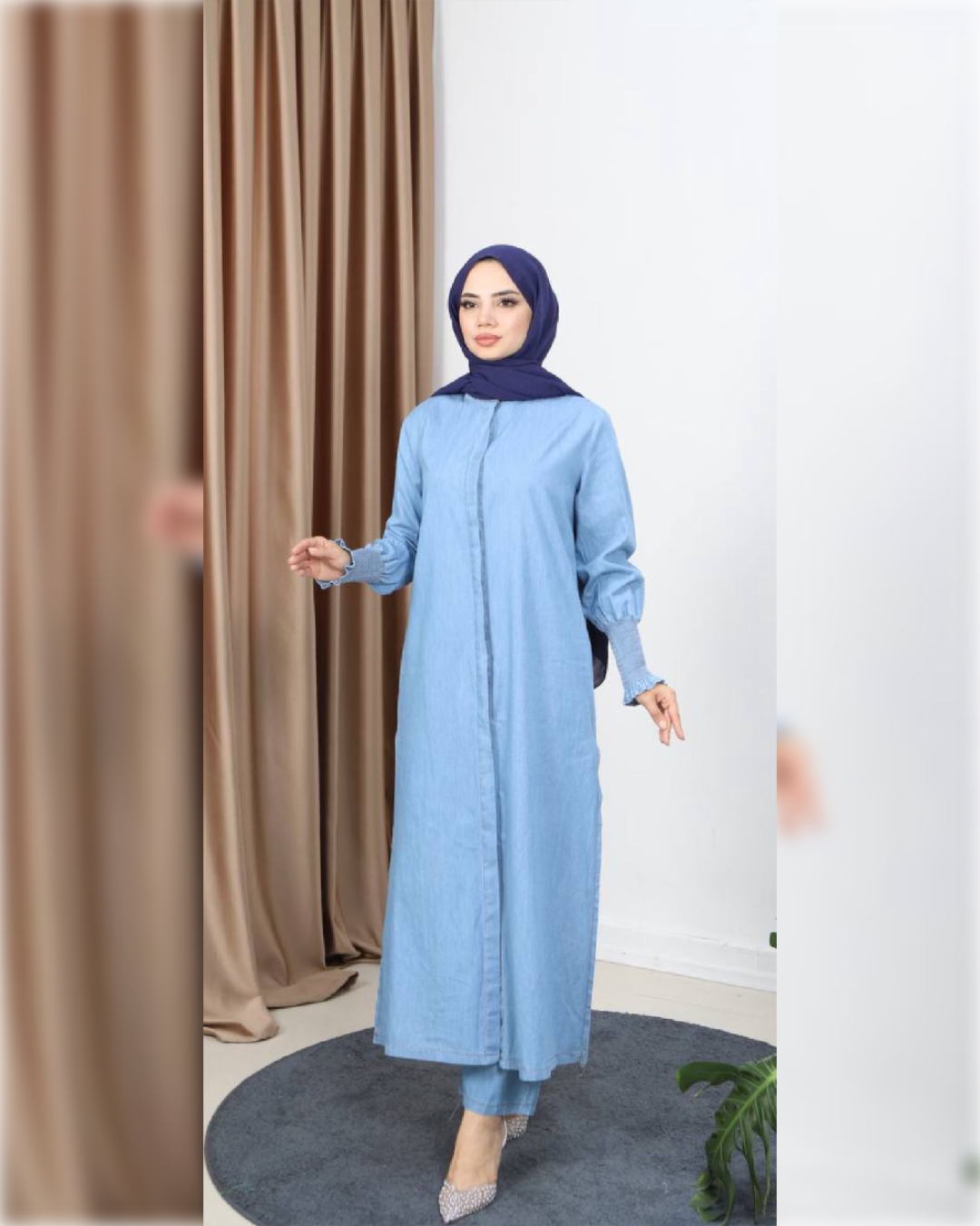 ارتقي بإطلالتك الكاجوال مع هذا الطقم العصري من الجينز المكون من قطعتين و المصمم ليتماشى مع الموضة المحتشمة الحديثة. يتكون الطقم من بلوزة طويلة واسعة مزودة بفتحات جانبية لسهولة الحركة و جيوب جانبية؟ يأتي مع بنطال طويل ليمنحك راحة وأناقة عملية في آن واحد.