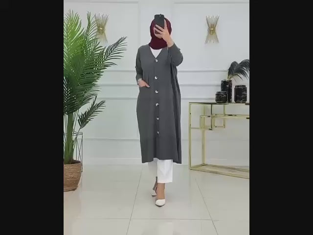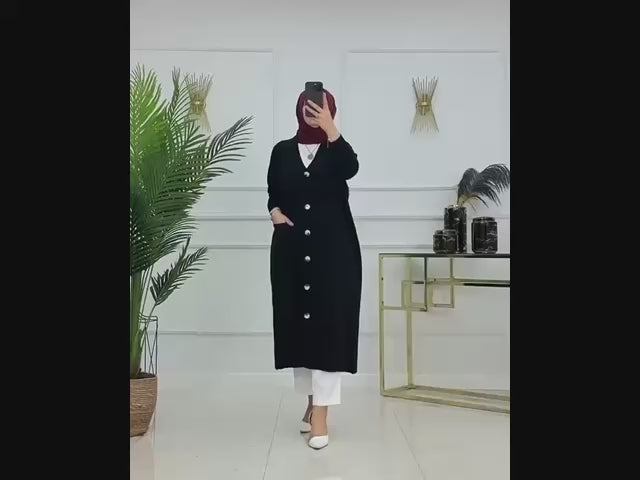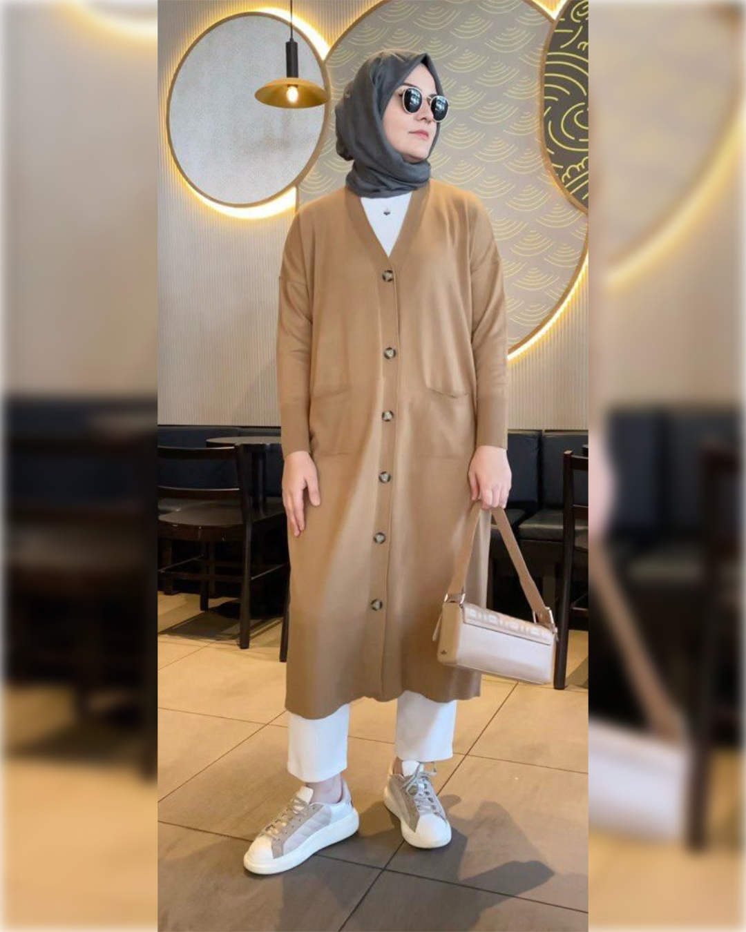 2. هذا الكارديجان بالياقة المميزة و مزود بأزرار أمامية و لون جميل ثابت و طوله يصل لأسفل الركب مما يوفر تغطية مثالية.