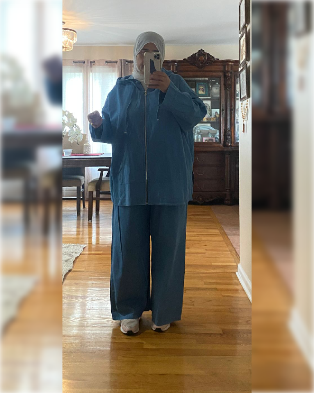 Elevate your casual look with this stylish denim two-piece set, designed for modern modest fashion. The set features a relaxed-fit hooded top with a front zipper, kangaroo pockets, and a slightly longer back hem for extra coverage. Paired with wide-leg denim pants, this outfit offers both comfort and effortless chic style.