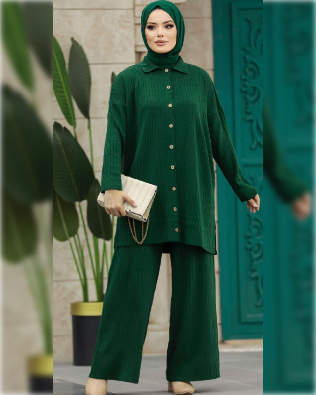 Talia Buttoned - Tricot - Dark Green - 2-Pieces Outfit in Wool طقم تاليا الشتوي من الصوف الناعم مكون من قطعتين مع أزرار باللون الأخضر الغامق الجميل